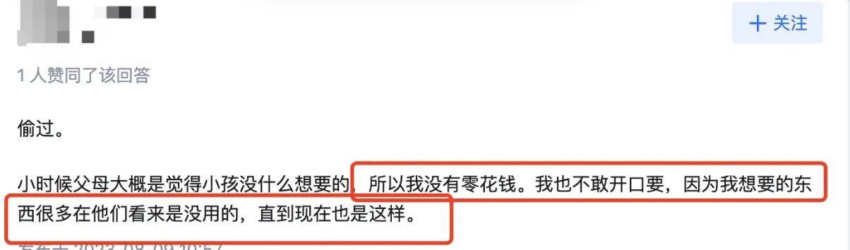 就像回答“你小时候偷拿过家里钱吗?”这个问题的知乎网友所说,小时候父母觉得小孩没啥想要的,所以不给零花钱,自己也不敢开口要,因为想要的东西在他们看来也是没用的。