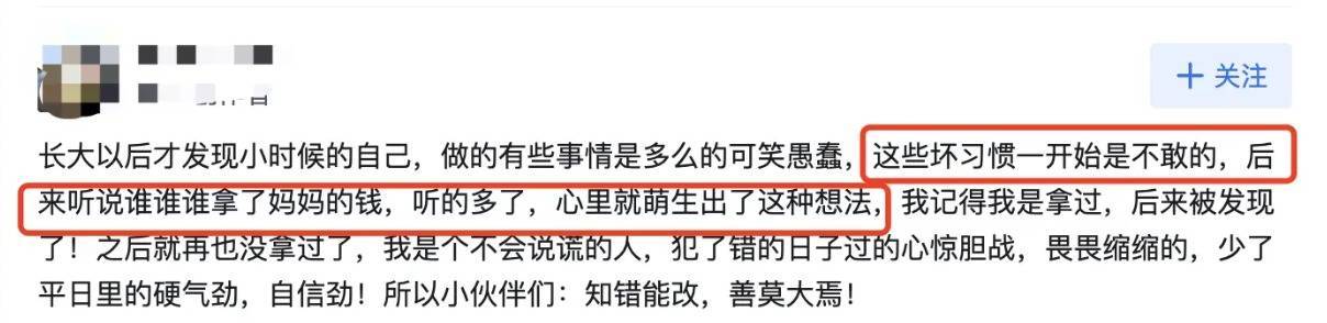 比如,下面这个小时候曾偷过家里钱的网友就说,这些坏习惯一开始是不敢的,后来听说谁谁谁拿了妈妈的钱,听得多了,心里就萌发了这种想法……